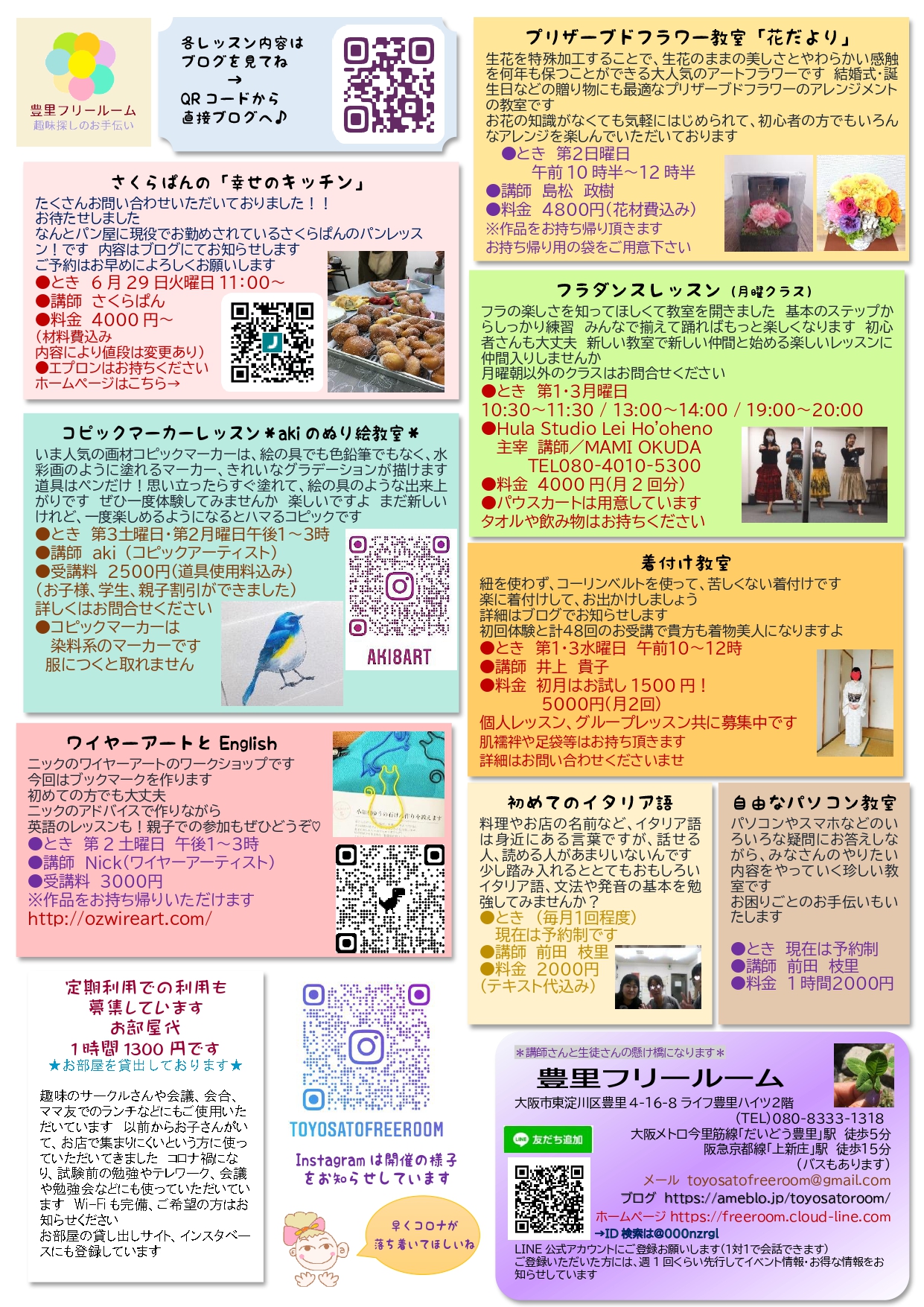 豊里フリールームでレッスンしている講師さん、地域のハンドメイド作家さん、イベント参加してくださる方が集まり、年に数回、豊里フリールームでワークショップや販売などを行っています